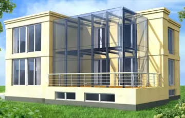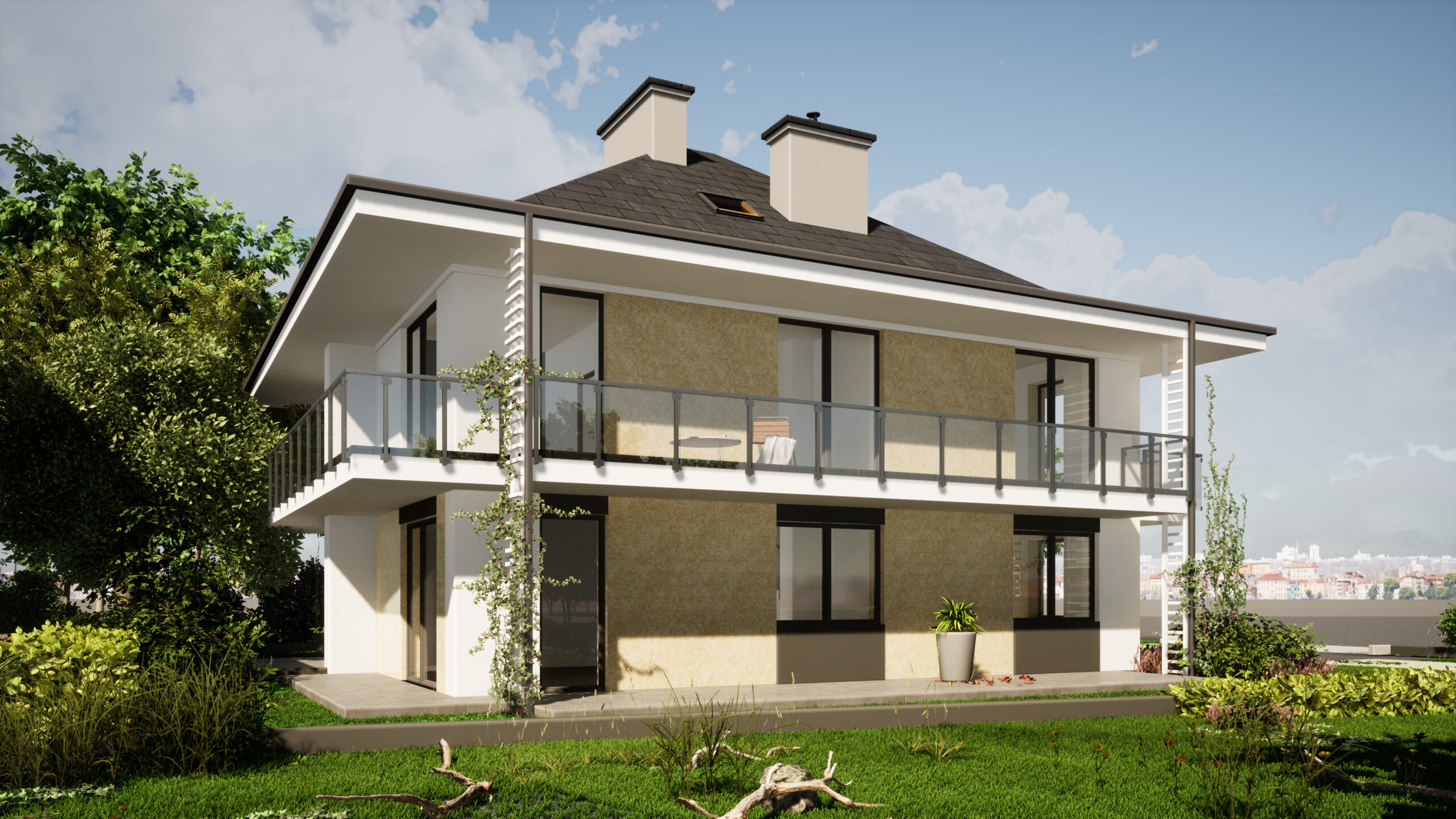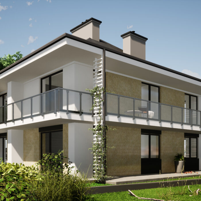 • nowoczesna elewacja z dużymi przeszkleniami,
